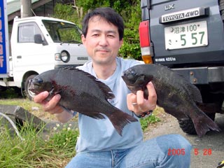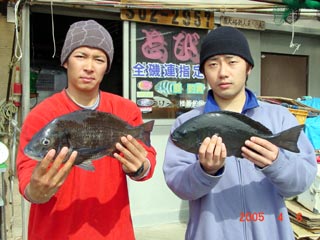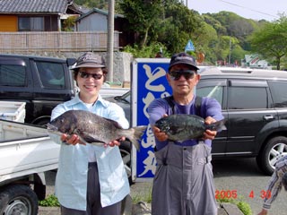 4/06ワレイシ 15.0℃濁り チ-ムOGATA 左 伊勢谷真史氏 黒鯛45cm 右 井出 慎二氏 メジナ40cm ガッツだぜ!