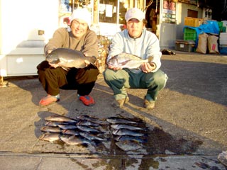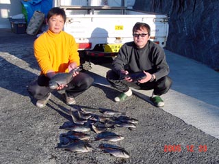 12/20トビシマ 15.0℃ 薄濁り 朝霧市 吉岡千春氏(左) 大手 貢氏(右) メジナ40cm頭に30枚GET!