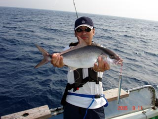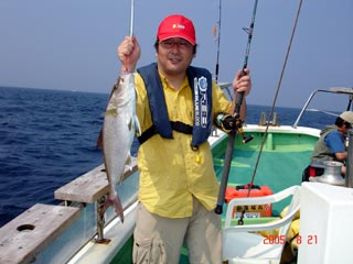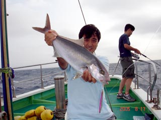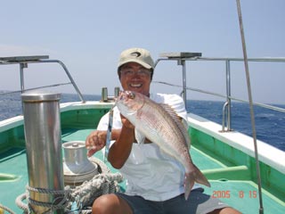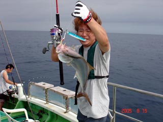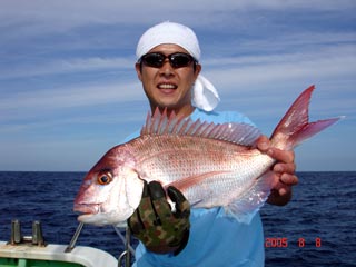 8/08銭洲 本間氏マダイGET! 大型カンパチ来ましたが、ラインブレイク (>_<) ジグは、フィッシャ-マンロングジグ 110g グリ-ンシルバ-でした! あー苦やしか~(>_<)