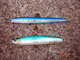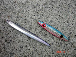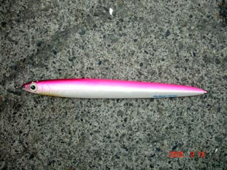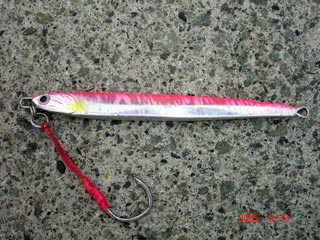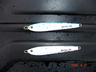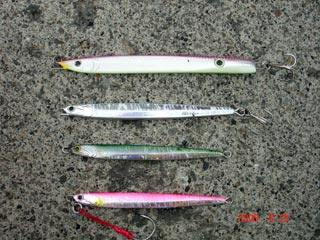 浜さんの当りジグ 右から トビホップ キメジ イワシホップ キメジ メジウム 165g ハガツオ セグロ 150g ピンク 良型カンパチ バラシ(>_<) 橋本氏の当りジグ D,S 3オンス ピンク銀箔使用 カンパチ2本 最後は大型バラシ(>_<) でかかったです!