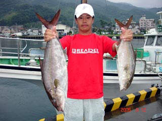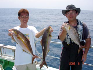 8/16銭洲 右 大崎氏 カンパチ1.55-3.65kg3本 左 毛利氏 カンパチ1.25kg 暑さに負けず頑張りました!
