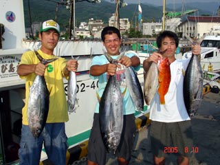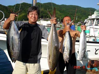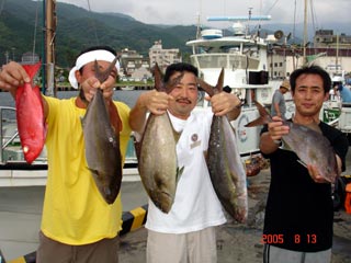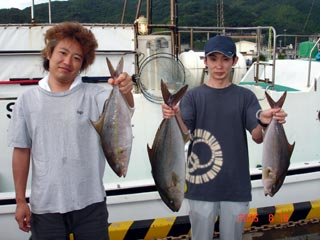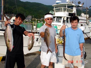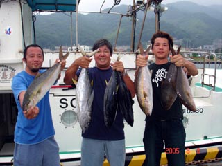 8/06銭洲 右から 北澤氏カンパチ1.55ー2.15kg3本 木野氏 キメジ3.6ー5.15kg3本 池田氏 カンパチ2.15kg 暑い中!頑張りました! 気合です!
