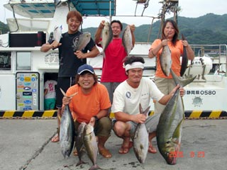 8/23銭洲 前列右 金澤氏 カンパチ3本 オオカミ1本 前列左 塩谷氏 カンパチ2本 キメジ1本 後列右 アザラシマル ママゴン カンパチ2本 後列中央 大極氏 カンパチ1本 後列左 大沢氏 カンパチ1本
