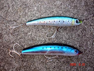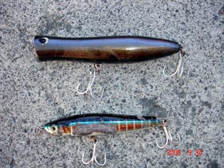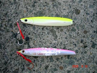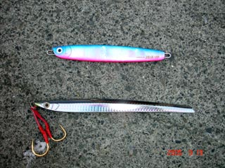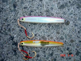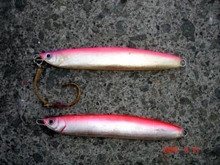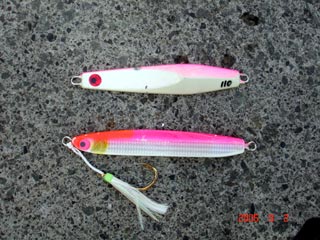 上が三澤氏のジグ ハオリ ピンクグロー 110g 下は太田氏のジグ シ-フラワ- ピンク 110g 何れもピンク!朝の潮は濁りでした! |