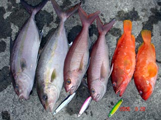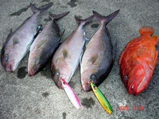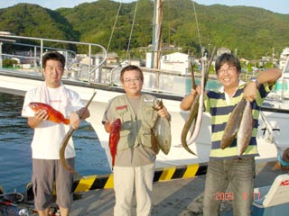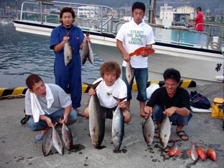 9/09銭洲 右~佐野氏 カンパチ3本、平田氏 カンパチ、アカハタ 右3番 石川氏 カンパチ、滝田氏 カンパチ、 左1.2 島田氏 アカハタ、福井氏 カンパチです! 頑張りました!名古屋はバブリ-(^。^)♪てか~
