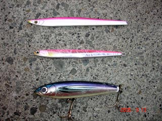 9/13銭洲でのHITジグ 上から CBM135g セグロ ピンクシルバ-手曲げ キメジ セグロ ピンクホロ 150g カンパチ スティッピンジャ-ク SWELLS カンパチ