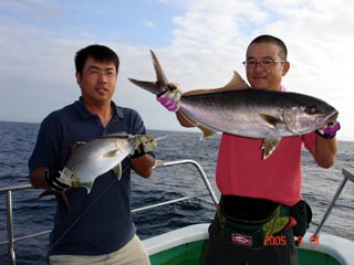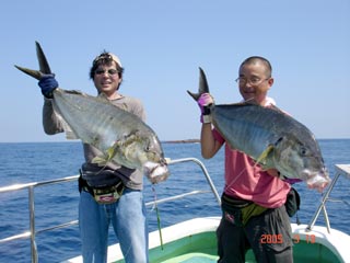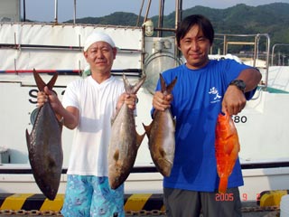 9/02銭洲 左 三澤氏 カンパチ2.1ー2.8kg 右 太田氏 カンパチ1.45kg アカハタは入れ食いでした!