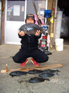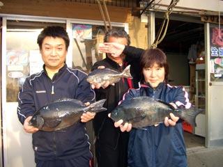 1/05トビシマ 14.7℃澄み加減 テトラポットの皆さん!メジナ40枚以上GET! 小型はリリ-ス! 右~大塚氏42.3cm 進藤氏45.2cm 前山氏37.2cm 前山さん!必勝アイテム有難う(^o^)丿