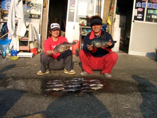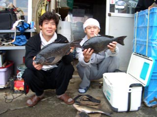 2/06ワレイシ 13.5℃薄濁り 伊豆くしろ研究会 (右)田窪氏 (左)梅原氏 低水温で25-38cm20枚です!頑張りました! |