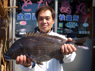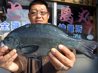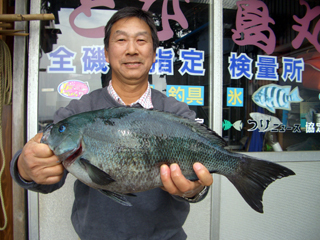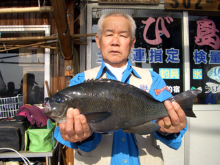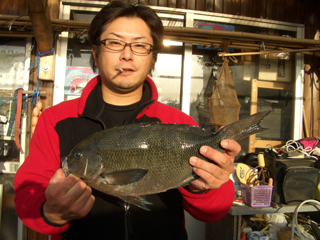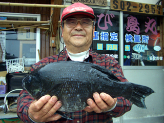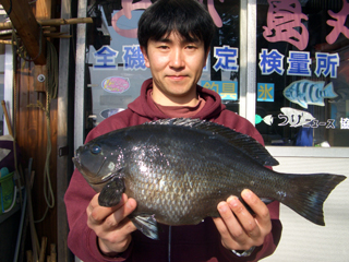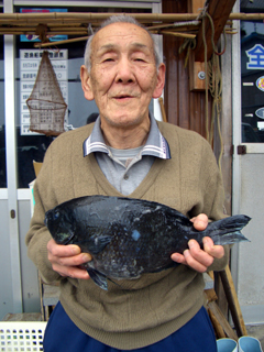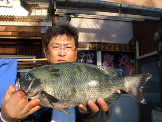 3/01 中ノ島 14.9℃薄濁り↑ 川崎市 渋谷照治氏 81歳 メジナ42cm (*^_^*)V