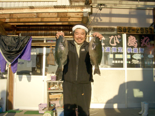 02/21伊豆くしろ研究会第13回くしろカップ 左 1位の大塚 泉氏 メジナ48.6cm38.2cm合計86.8cm 右 伊豆くしろ研究会会長 宮部慎介氏