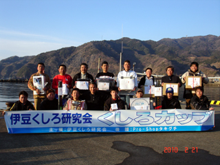 02/21伊豆くしろ研究会第13回くしろカップ開催 水温15.1℃澄み加減 潮トロトロ メジナ2枚の合計長で競いました!入賞者の皆さんです。