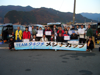 12/05 チームタキグチ第14回メジナカップ 入賞者の皆さんです メジナ2枚の合計体長で競いました! 優勝 宮部慎介氏 47.5,42.5 90.0cm2700g 準優勝 小林 勉氏 47.0,39.0 86.0cm2450g 3位 加藤弘孝氏 42.1,39.0 81.1cm1750g 4位 前山敏彦氏 41.8,38.2 80.0cm1900g 5位 虎岩和男氏 45.3,33.7 79.0cm1900g 6位 寺田明宏氏 40.3,38.1 78.4cm1800g 7位 進藤晃一氏 41.5,36.1 77.6cm1800g 8位 杉村太志氏 44.5,32.5 77.0cm1700g 9位 萩原 氏 42.134.5 76.8cm1650g 10位 鈴木新太郎氏 39.5,35.8 75.3cm1600g 11位 朝倉文夫氏 38.5,35.5 74.0cm1400g 12位 大塚 泉氏 43.8,29.2 73.0cm1650g 大物賞 日浦克義氏 メジナ41.3cm 他魚の部 小和瀬雄一氏 黒鯛35.5cm 参加者及び大会関係者の皆さん。お疲れ様でした!