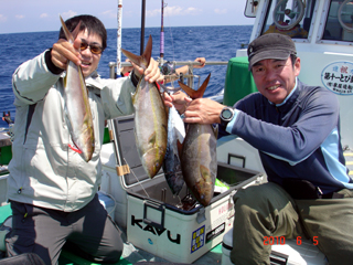 6/05 銭洲 カンパチ1.15-5.45kg11本(ルアカン3本) モロコ27.7kg、マダイ交る