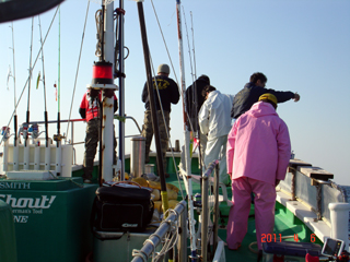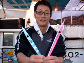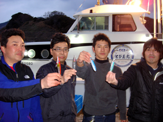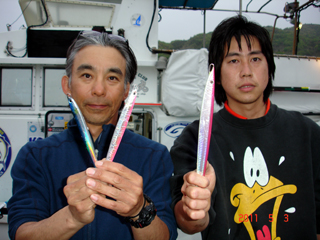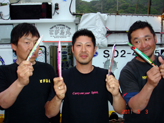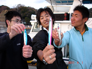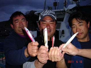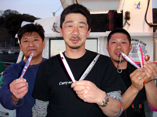 4/01 銭洲解禁 ルアカンジグ公開! 東海大学海洋学部 釣魚部ご推薦! 左から佐藤氏、野平名人、大滝くん…(ーー;) ノンキ150gマイワシ、DAIWAサクリファイススティック140g ディープライナー180gオールシルバー