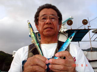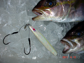 6/04 笹原氏!本日のチョイス! 左 セグロ ムロカラー150g ルアカン2本 右 テツジグ ショート150gブルー 大政9.9kg