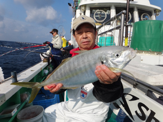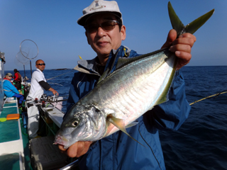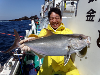 4/29 銭洲 19.5℃ 濁り 沼津市 藤原三雄氏 シマアジ1.55-1.95kg3枚 久しぶりの銭洲!竿頭GET!おめでとう!