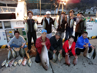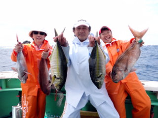 4/15 銭洲 古山佐恵子さん、古山篤基氏、伊藤店長 マダイ、シマアジ何でも来い!です(^。^)