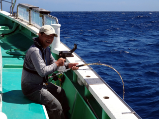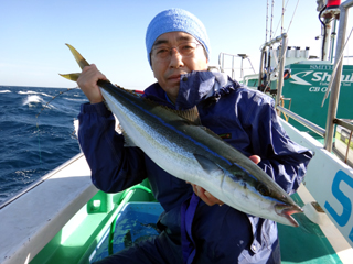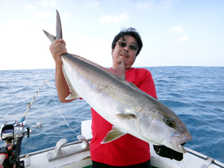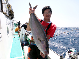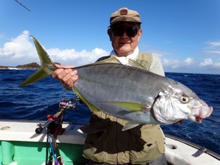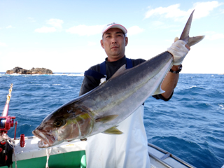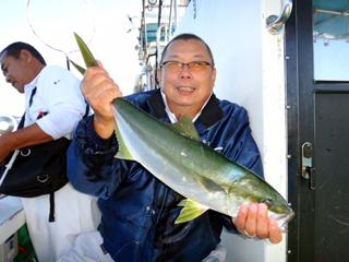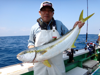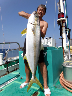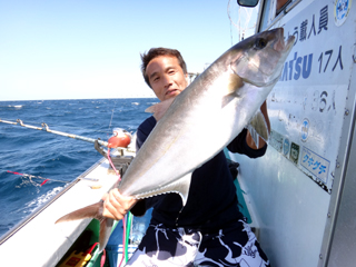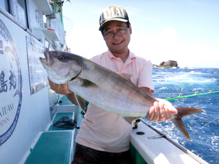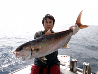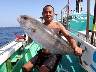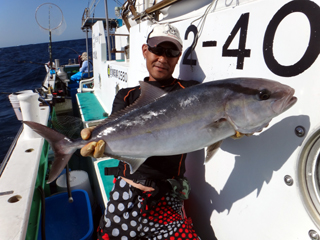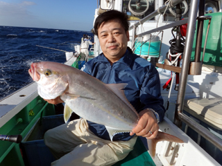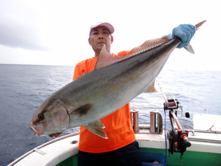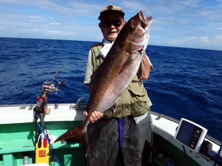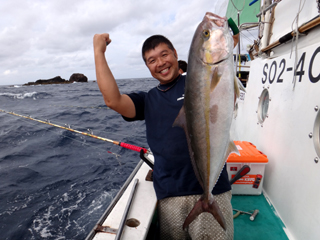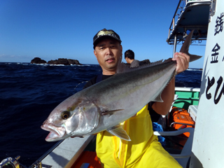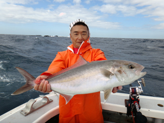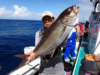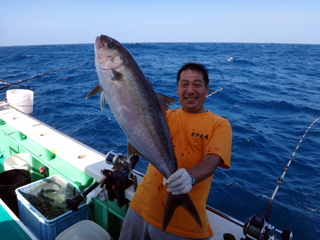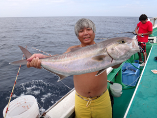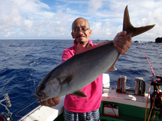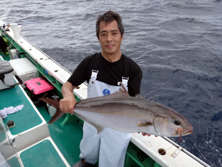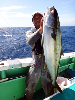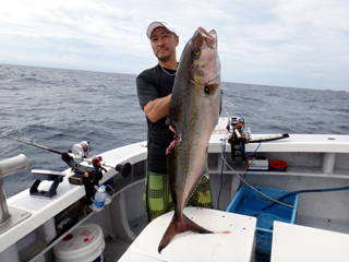 9/01 銭洲 26.8℃薄濁り チビムロ作戦 一級建築士の永山先生 カンパチ釣りも先生です。 カンパチ6.3kg