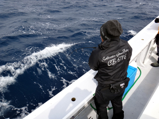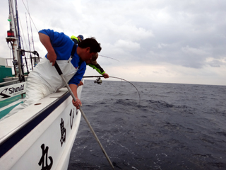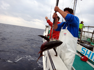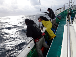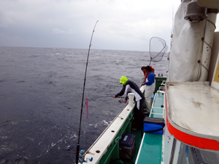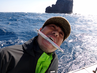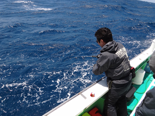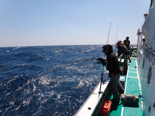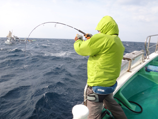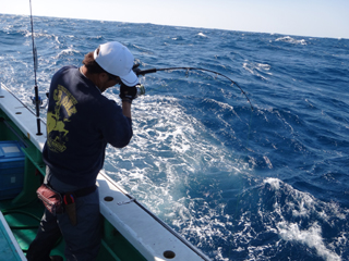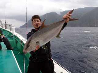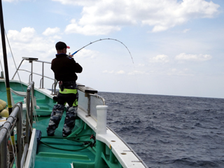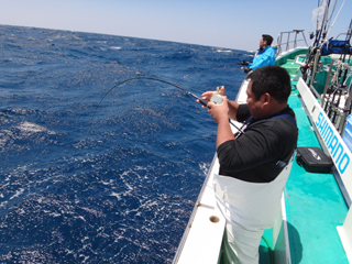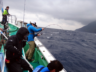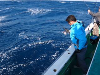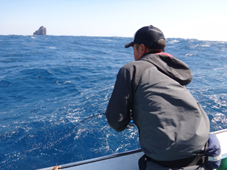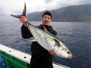 3/31御蔵島沖 21.8℃澄み メロン屋工房公認テスター 財津大樹氏 キハダと格闘中…余裕のよっちゃんです!