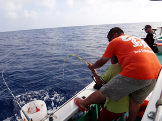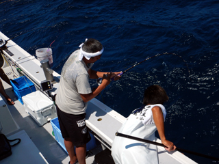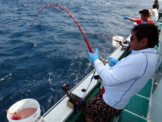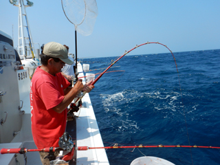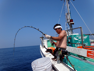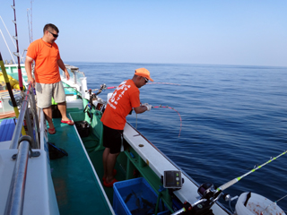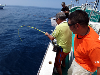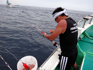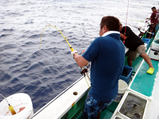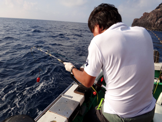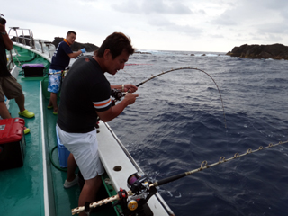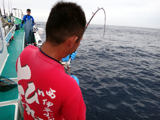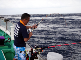 7/26-27 大人の遠足 part Ⅳ 銭洲→藺灘波→藺灘波 名古屋FishingKING釣行会 2日目藺灘波28.4℃澄み M爺~ 伊藤店長さんのご指導のもと、ヒット!