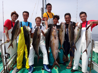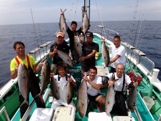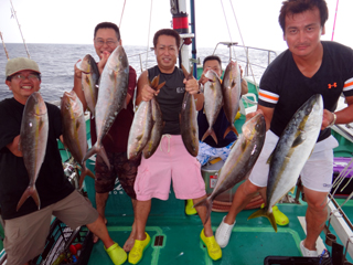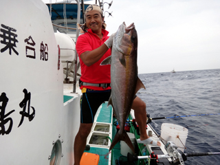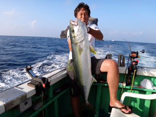 7/26-27 大人の遠足 part Ⅳ 銭洲→藺灘波→藺灘波 名古屋FishingKING釣行会 2日目藺灘波28.4℃澄み Dr,Hさん!モヒカンの「ヒ」15.75kgGETです! 残るはカンパチ15kgオーバーですね!頑張りましょう!