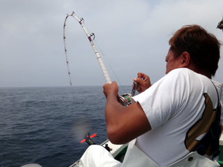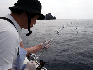 7/06 銭洲 23.4℃濁り アカイカ作戦 沼津市 Wさん。 レンタルロッドでのカンパチファイト ロッド:アリゲータ クレイジー180 リール:TicaT-SP16