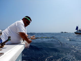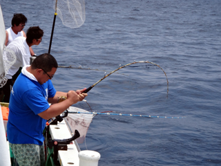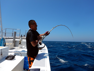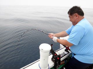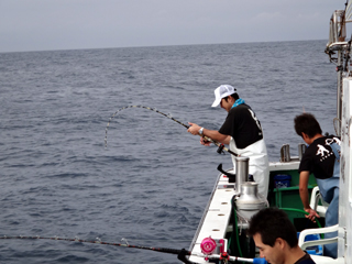 7/07 銭洲 23.3℃澄み ムロアジ作戦 JapaneseマフィーアのMさん。 カンパチ6.0-7.65kg2本 大きいのら・し・き・バラシ。 バラシた魚はデカくなかったですか??? 船長の目には、かなりの大物に見えましたが。 下の写真が、大物ら・し・き・アタリです↓