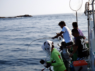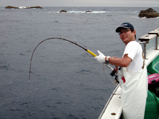 7/06 銭洲 23.4℃濁り アカイカ作戦 Dr,H様 カンパチ5.95kg 黙々と釣りする姿を拝見して、集中力凄し!と頭がさがります。 船長信じて頑張ってくれている。 感謝!感謝!感謝です。 自己新記録に向かい一直線!迷いはありません。 至れり尽くせりのスーパーVIPシステムご愛用願い有難う御座います。 もっと快適な!もっと優雅なシステムへ! シズテムアップさせて行きますので今後ともご哀願宜しくお願い致します。 有難う御座いました。