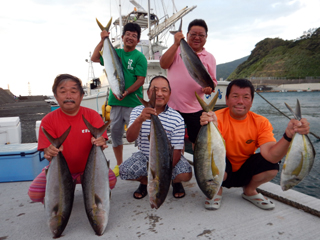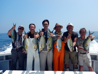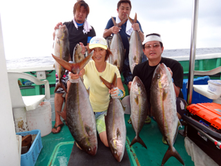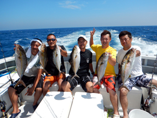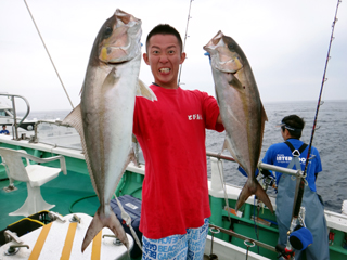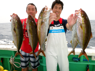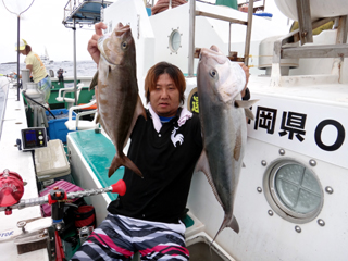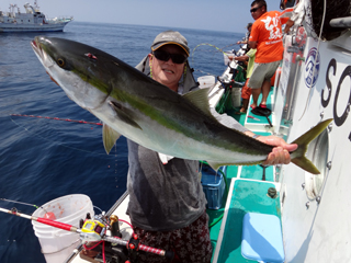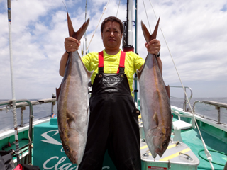7/05 銭洲 22.5-24.1℃濁り アカイカ作戦 茨城県 Y様 カンパチ4.35-6.4kg3本 オラオラ。万歳\(^o^)/持ち。 このポーズ。キツイのです。でも、頑張って持っていただきました。 Yさん。マッサージ必要ですね。 アカイカで1本。ムロアジで2本。バラシ数回。。。 当たりまくりの良い日になりました。 サクランボ効果アリアリでしたね。有難う御座いました。 この調子で一泊遠征、宜しくお願いします! 頑張りましょう!目指せ!モヒカン! 目指せ!チャンピオン!です。
