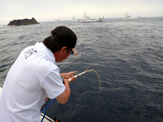 7/02 銭洲 23.8-21.1℃薄濁り アカイカ作戦 極の会 N会長 ん~~ きまってます。 ロッド:剛樹バンブー(竹仕様)
