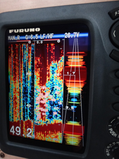 5/08 銭洲 20.5℃ 薄濁り シマノ NEW探見丸 お魚マークです(^。^)