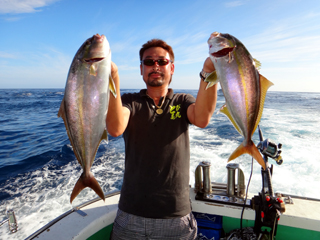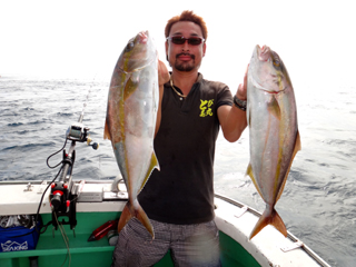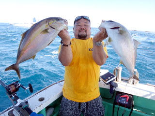 8/21 銭洲 26.4℃薄濁り S様 ヒラマサ6kg頭に2本 ご希望のカンパチは釣れませんでしたが、ヒラマサダブルキャッチでした!