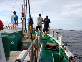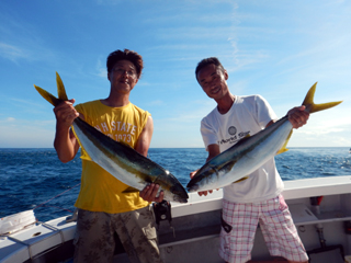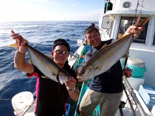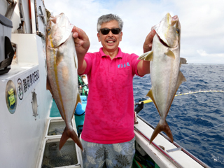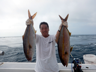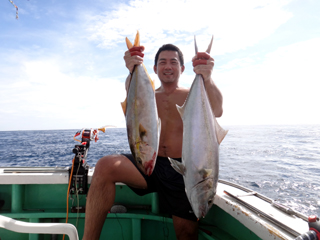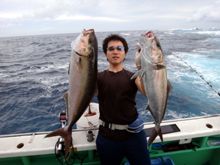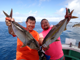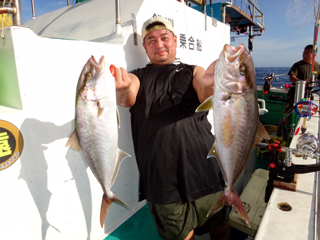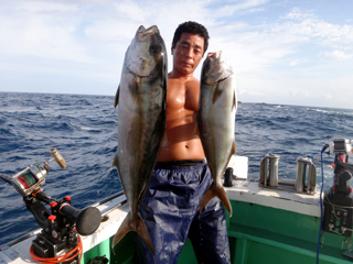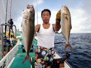 8/02-03 大人の遠足 part 6 銭洲→藺灘波→銭洲 2日目銭洲27.4℃澄み 左 Mさん カンパチ2.2-2.25kg3本 右 Sさん カンパチ1.95-2.0kg2本 次回は大型GETしたいですね!