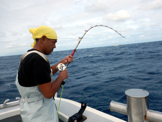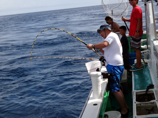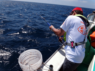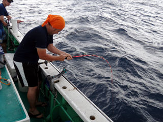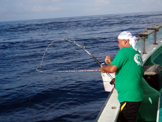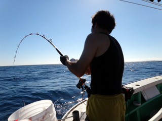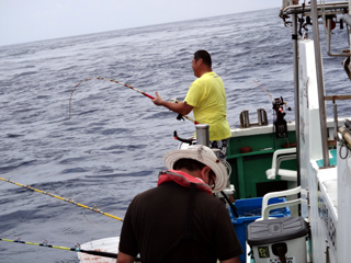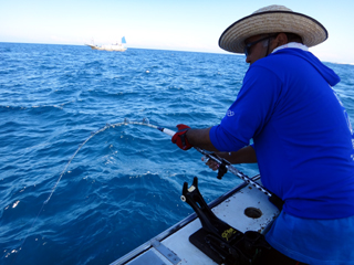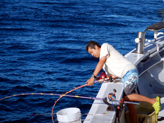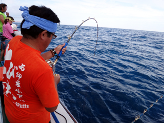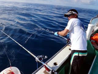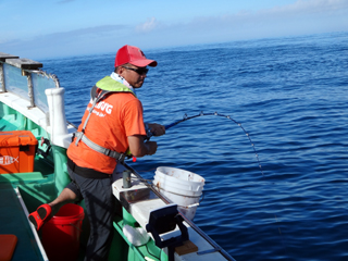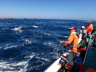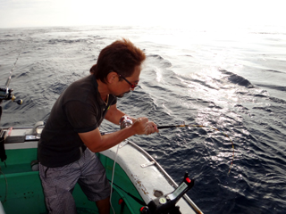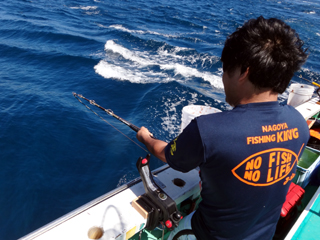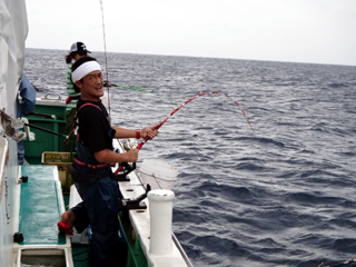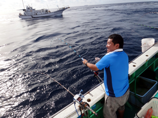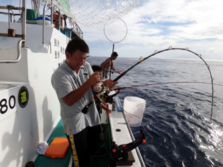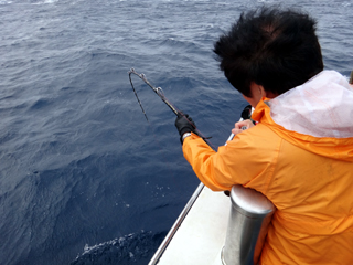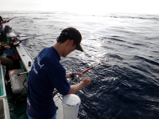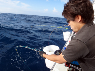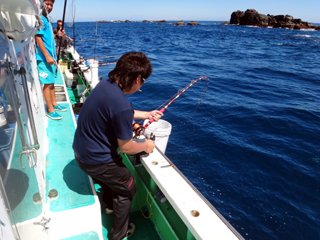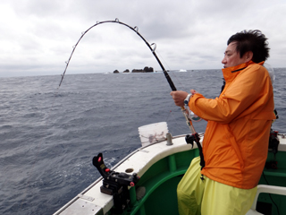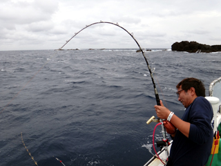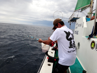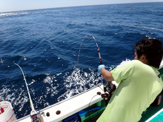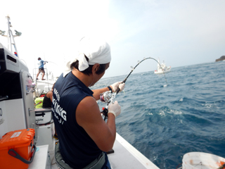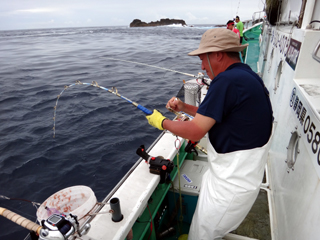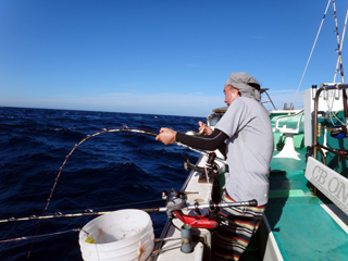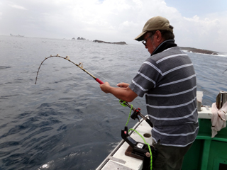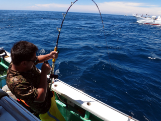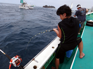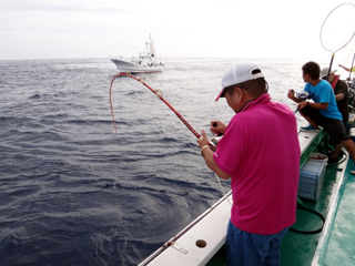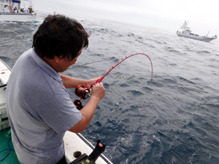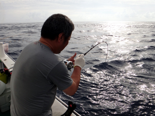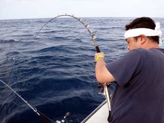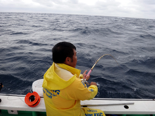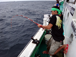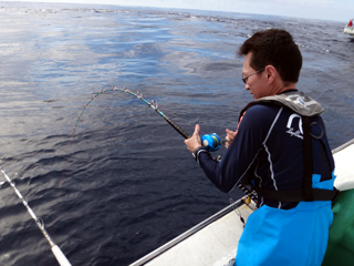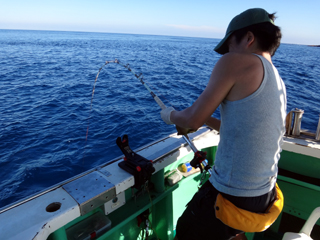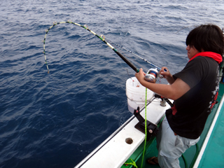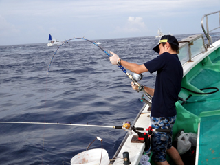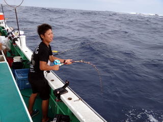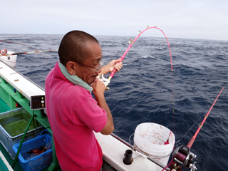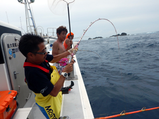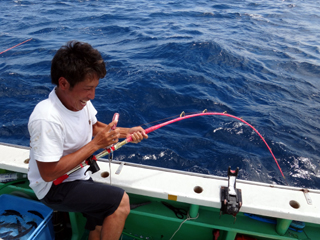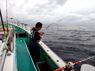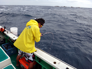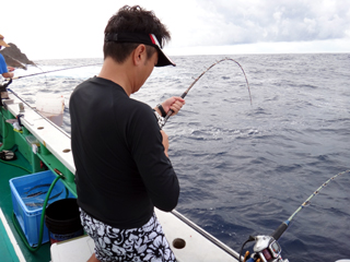 8/19 銭洲 26.5℃薄濁り O様ファイトシーン 初ヒットでございます。慎重にファイトしております。