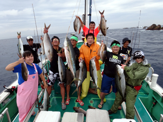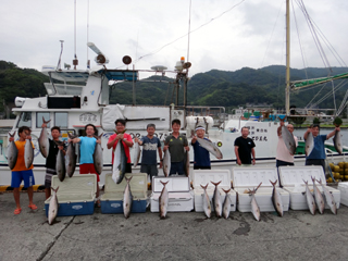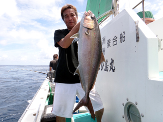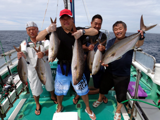 8/14 銭洲 26.6℃薄濁り Y親分 カンパチ5.15kg頭に3本 ご満悦です。 おめでとう御座います。