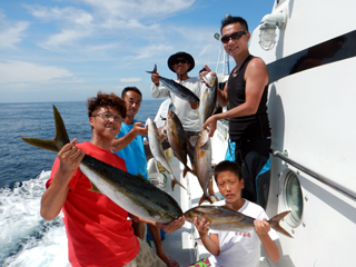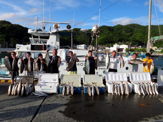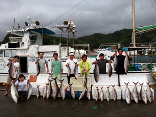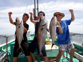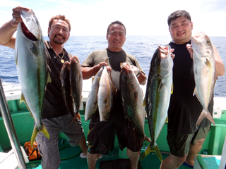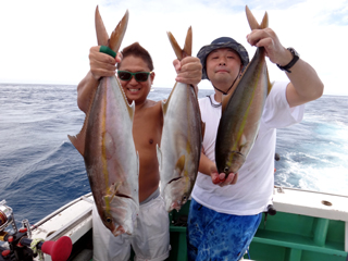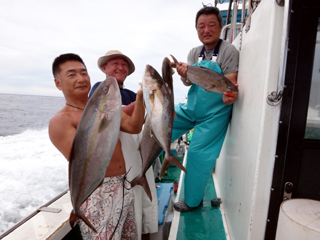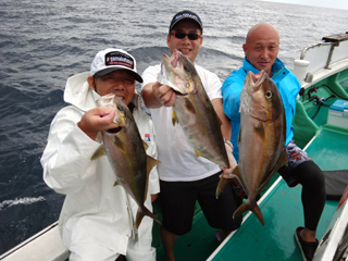 8/01 銭洲 26.6℃薄濁り チビムロ作戦 左 Dさん カンパチ1.6-2.75kg8本、マサ5.75kg 中 Fさん カンパチ1.8-6.65kg8本 右 I さん カンパチ2.0-3.1kg4本、マサ6.1kg