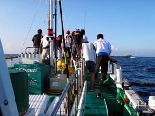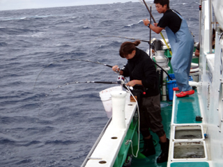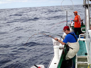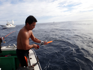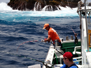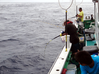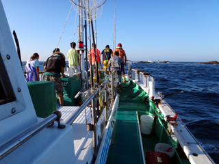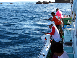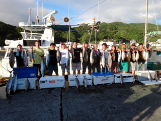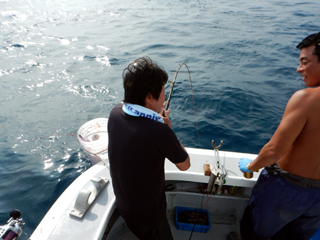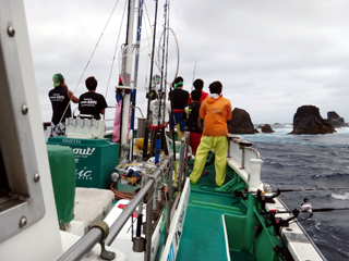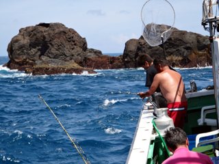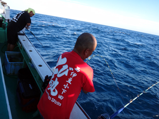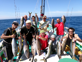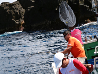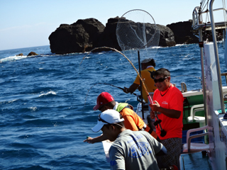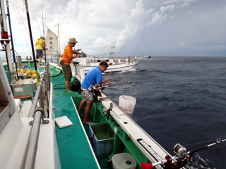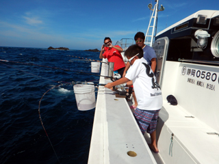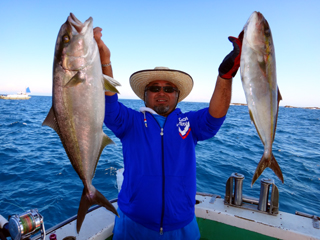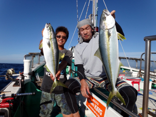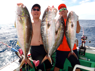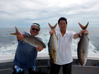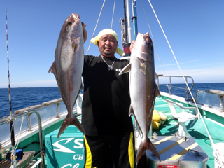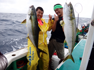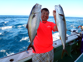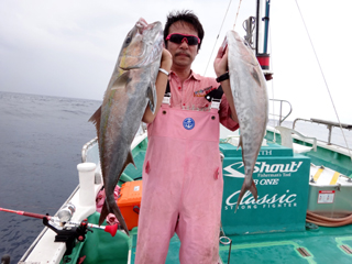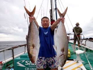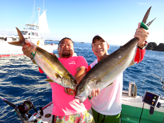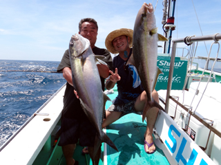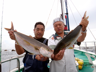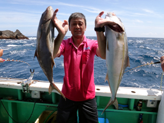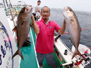 8/04 銭洲 27.5℃澄み チビムロ作戦 左 三島広小路つばさ寿司本店丸子店長 カンパチ2.25-3.5kg3本 右 Gさん カンパチ4.5kg頭に3本 仕入完了です!