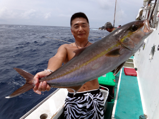 8/02 銭洲 27.3℃澄み チビムロ作戦 小平市 Y様 カンパチ2.15㎏! Y様いつも楽しい雰囲気を有難う御座います。