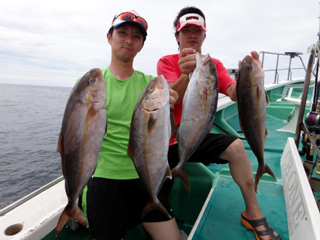 8/14 銭洲 26.6℃薄濁り 新潟さとみ丸 S様 カンパチ4.15-11.85kg3本