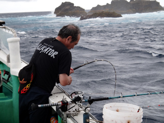 8/02-03 大人の遠足 part 6 銭洲→藺灘波→銭洲 1日目銭洲27.3℃澄み Wさん 超短ロッドで銭洲カンパチ!