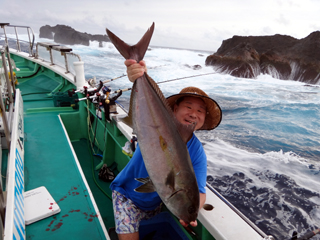 8/02-03 大人の遠足 part 6 銭洲→藺灘波→銭洲 1日目銭洲27.3℃澄み Wさん カンパチ6.45kg! ニコニコですね!