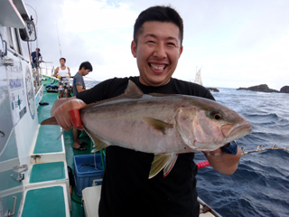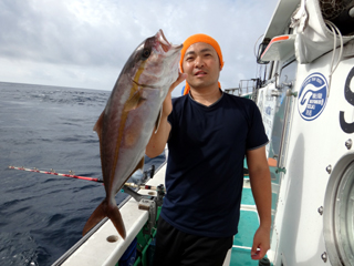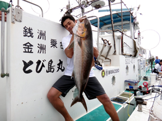 8/21 銭洲 26.4℃薄濁り N様 カンパチ2.35kg 初カンパチおめでとうございます! 前回は無念のバラシでしたがリベンジ成功です!
