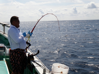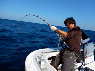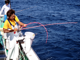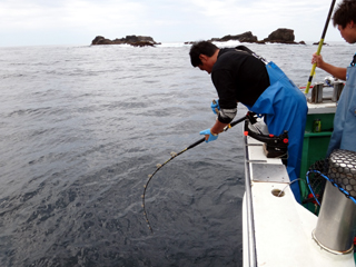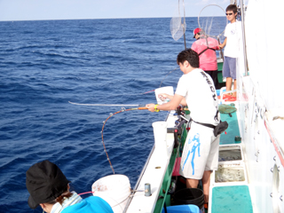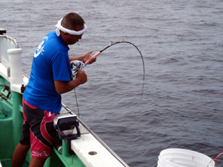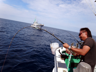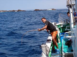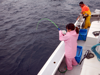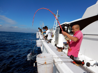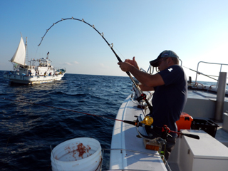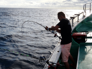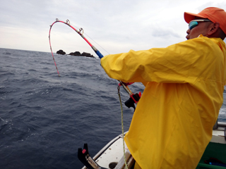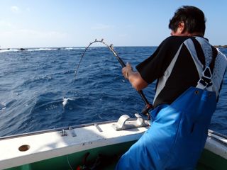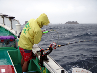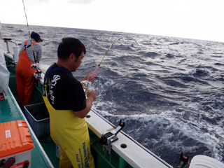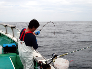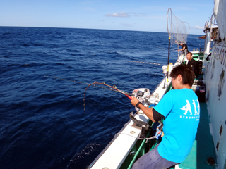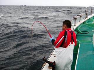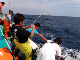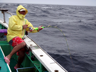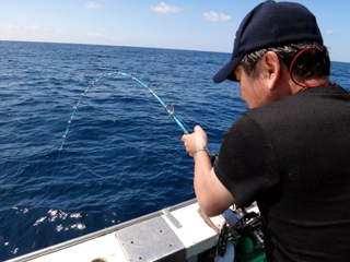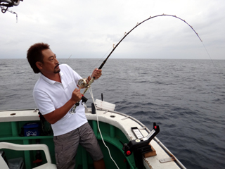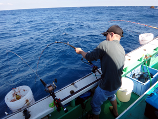 S様ファイトシーン カンパチ7.5kg竿が良い曲がりになっております。 良型カンパチおめでとうございます!現在のカンパチチャンピオンでございます。しかしながら油断大敵です!
