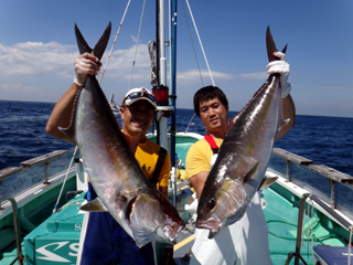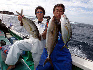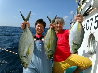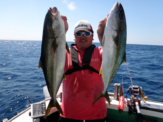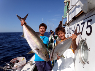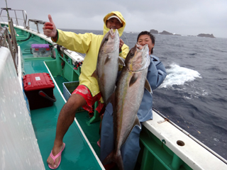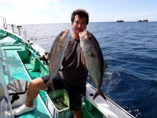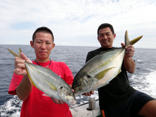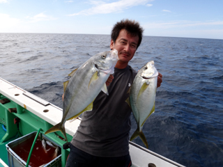 カンパチ王者独走中のSさん!モヒカンに挑む! 右 宮内君 シマアジ釣って嬉しそうです。