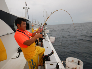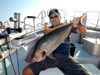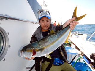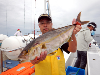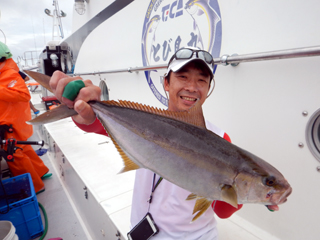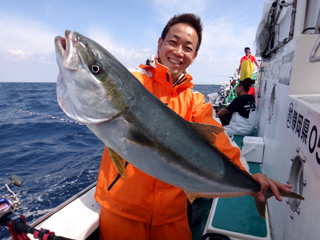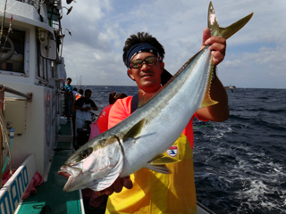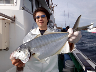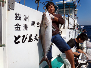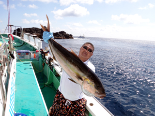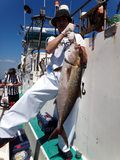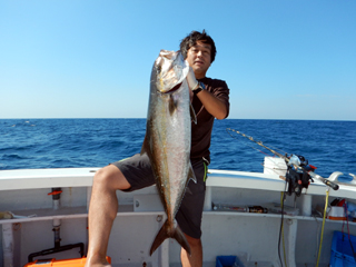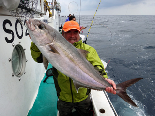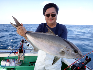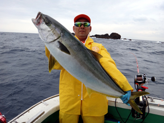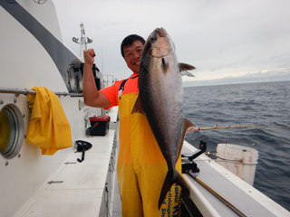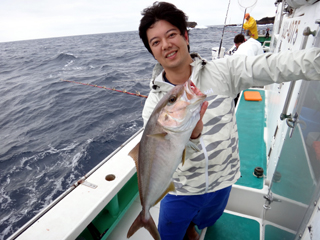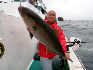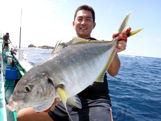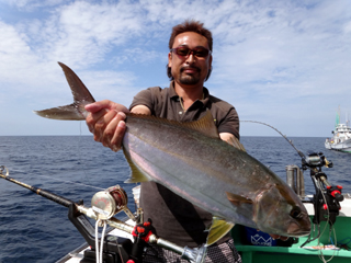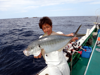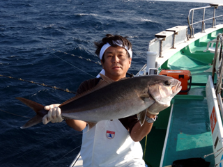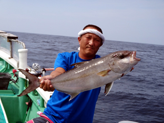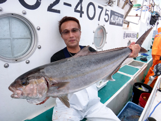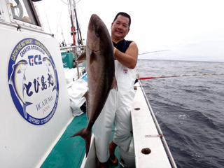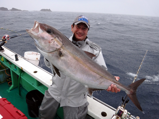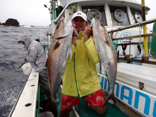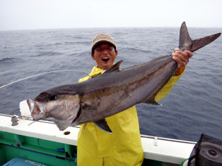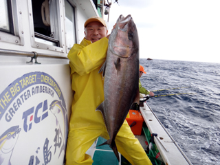 東京とび島会 Sさん。 Hさんの闘志に熱せられ、カンパチ9.05-11.7kg2本、シマアジ2.85kg 燃え!燃えで行きましょう!