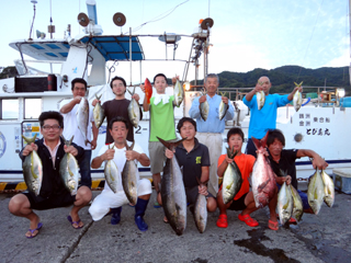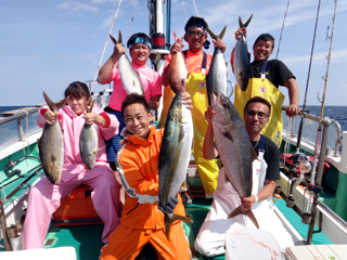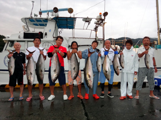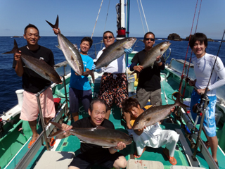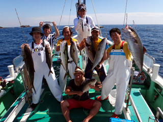 9/13 銭洲 25.2℃澄み VIP仕立 カンパチ2.6-10.8kg7本、ヒラマサ2.95kg 中央、Sさん カンパチ2.8-10.8kg3本、右 Wさん カンパチ9.4kg、Nさん カンパチ5.55-9.0kg2本 お見事でした!