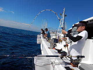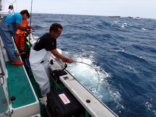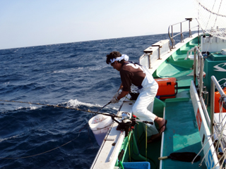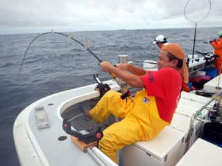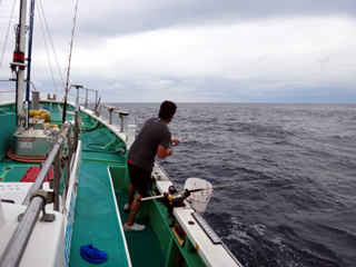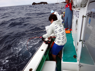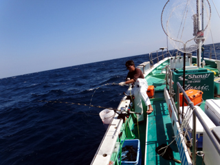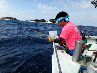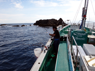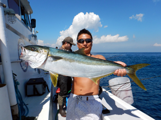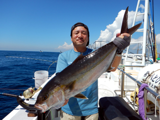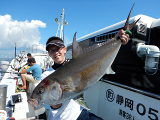 ノリノリのHさん。カンパチ7.1-9.1kg2本、ヒラマサ13.3kg。 Sさんに火を点けてくれました!熱いぜ!銭洲!