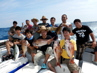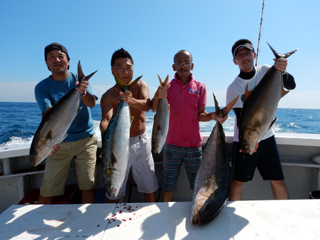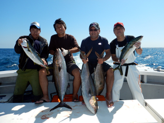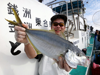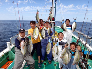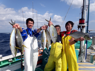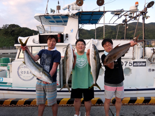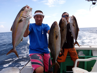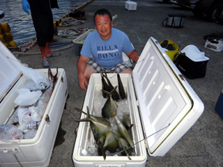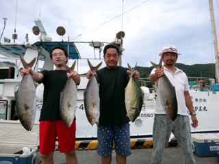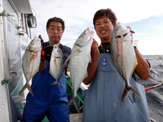 左 Yさん、シマアジ1.55kg16枚、中 Kさん、シマアジ、右 Y親分 シマアジ10枚、カンパチ2.65kg