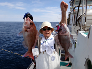 左 Kさん、カンパチ2.3-2.65kg2本、右 Hさん 真鯛ダブル!お見事です。